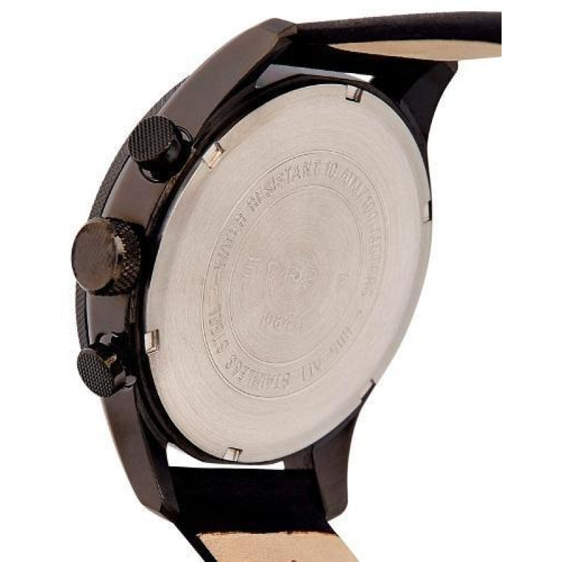Модель имеет водонепроницаемость 100 м. Корпус выполнен из материала – сталь + PVD. Прочное минеральное стекло надежно защищает циферблат от ударов и других повреждений. Удобный кожаный ремешок позволяет часам комфортно сидеть на запястье. Из дополнительных функций имеются: дата, дополнительный показатель времени в 24-х часовом формате, секунды, хронограф.