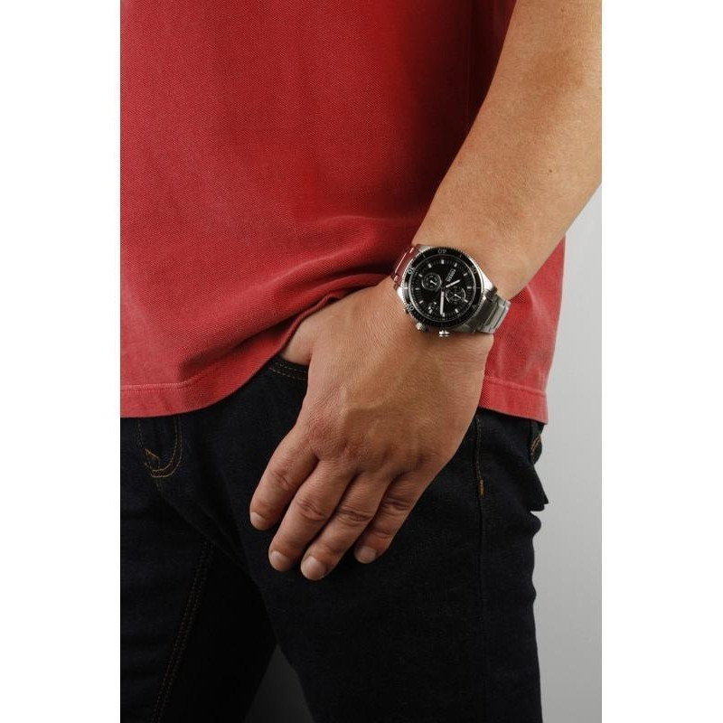 Модель имеет водонепроницаемость 100 м. Корпус выполнен из материала – сталь. Прочное минеральное стекло надежно защищает циферблат от ударов и других повреждений. Удобный стальной браслет позволяет часам комфортно сидеть на запястье. Из дополнительных функций имеются: дата, секунды, хронограф.