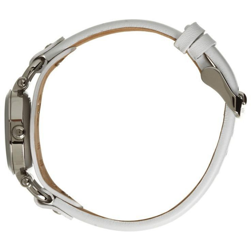 Перламутровый циферблат декорирован камнями Swarovski, ремешёк из натуральной кожи, механизм Miyota..