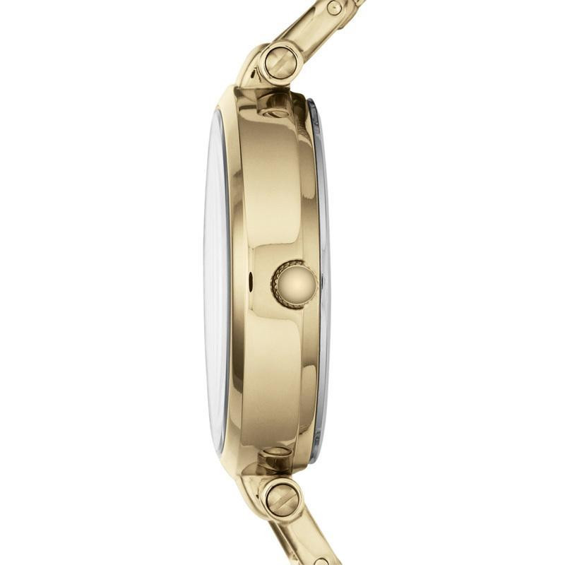 Модель имеет водонепроницаемость 50 м. Корпус выполнен из материала – сталь с позолотой. Прочное минеральное стекло надежно защищает циферблат от ударов и других повреждений. Удобный стальной с позолотой браслет позволяет часам комфортно сидеть на запястье. Из дополнительных функций имеются: минуты, секунды, часы.