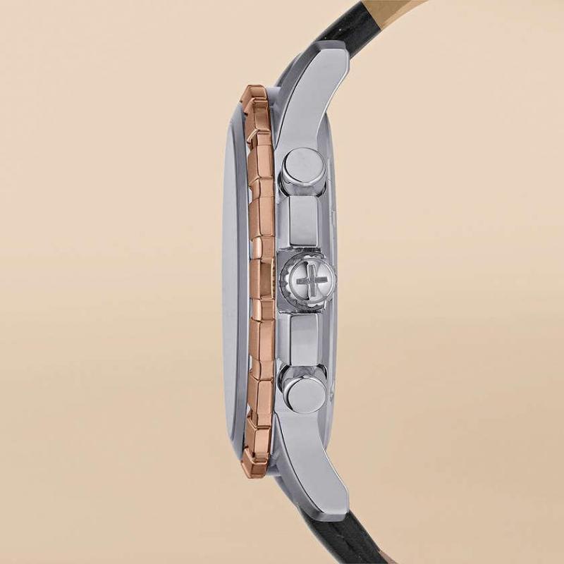Модель имеет водонепроницаемость 50 м. Корпус выполнен из материала – сталь + PVD. Прочное минеральное стекло надежно защищает циферблат от ударов и других повреждений. Удобный кожаный ремешок позволяет часам комфортно сидеть на запястье. Из дополнительных функций имеются: дата, секунды, хронограф.