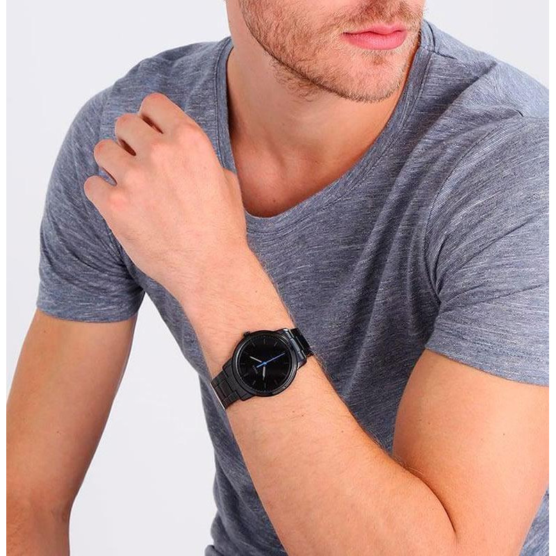 Модель имеет водонепроницаемость 50 м. Корпус выполнен из материала – сталь + PVD. Прочное минеральное стекло надежно защищает циферблат от ударов и других повреждений. Удобный сталь + PVD браслет позволяет часам комфортно сидеть на запястье. Из дополнительных функций имеются: секунды.