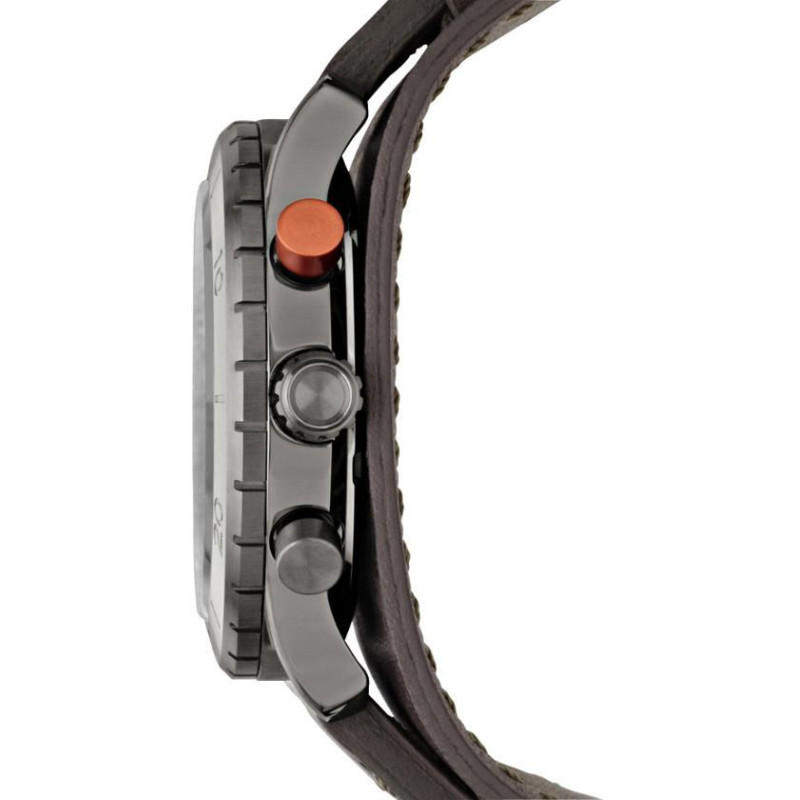Модель имеет водонепроницаемость 50 м. Корпус выполнен из материала – сталь + PVD. Прочное минеральное стекло надежно защищает циферблат от ударов и других повреждений. Удобный кожаный ремешок позволяет часам комфортно сидеть на запястье. Из дополнительных функций имеются: дата, дополнительный показатель времени в 24-х часовом формате, минуты, секунды, хронограф, часы.
