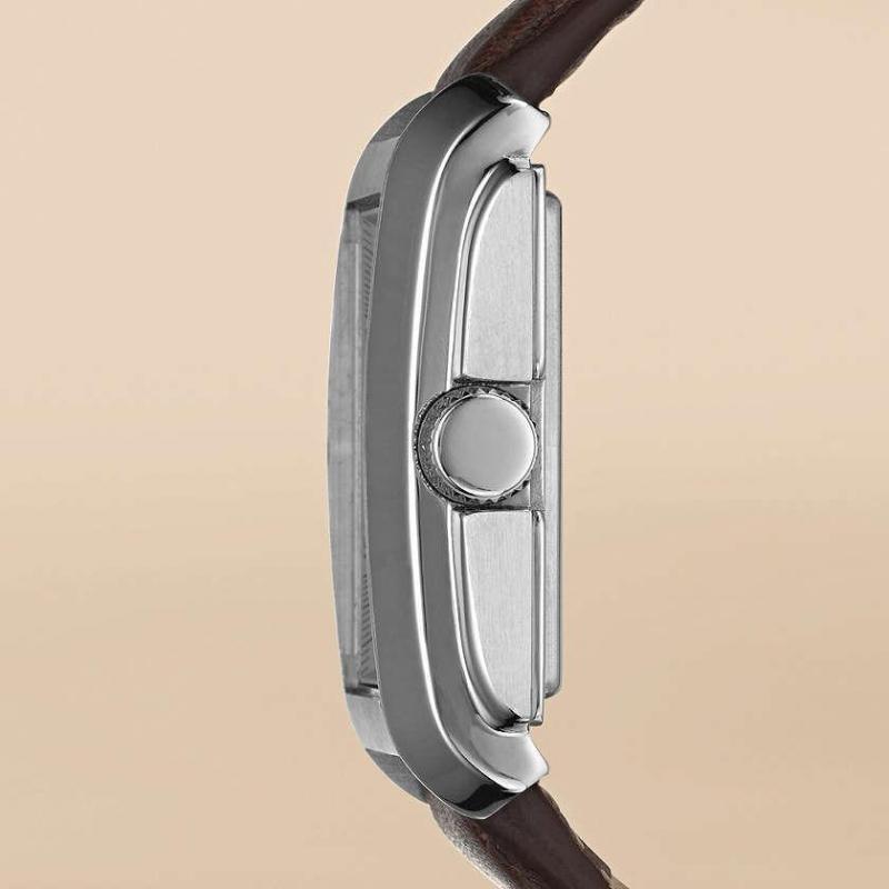 Люминесцентные стрелки и метки. Корпус из нержавеющей стали. Коричневый кожаный ремешок. Цвет циферб..
