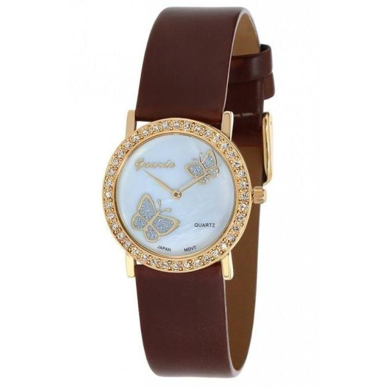 Светлый циферблат с бабочками, коричневый кожаный ремешок. Корпус инкрустирован цирконами...