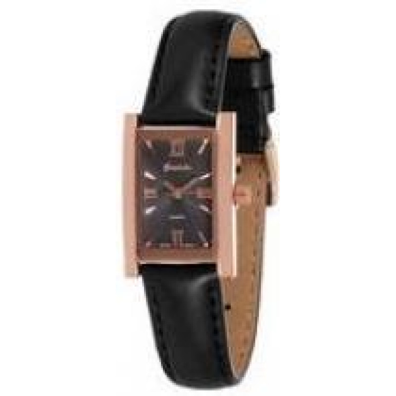 Женская модель прямоугольной формы. Ремешок и циферблат черного цвета. Индикация - римские цифры и м..