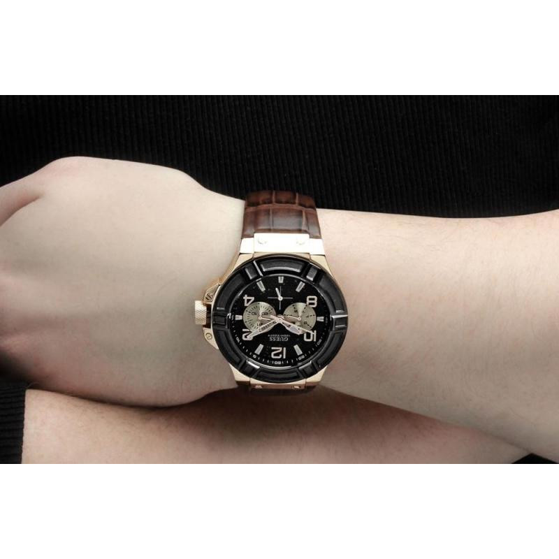Модель имеет водонепроницаемость 100 м. Корпус выполнен из материала – сталь + PVD. Прочное минеральное стекло надежно защищает циферблат от ударов и других повреждений. Удобный кожаный ремешок позволяет часам комфортно сидеть на запястье. Из дополнительных функций имеются: дата, день недели, секунды.