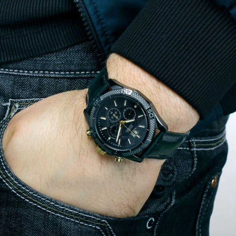 Модель имеет водонепроницаемость 100 м. Корпус выполнен из материала – сталь + PVD. Прочное минеральное стекло надежно защищает циферблат от ударов и других повреждений. Удобный кожаный ремешок позволяет часам комфортно сидеть на запястье. Из дополнительных функций имеются: дата, дополнительный показатель времени в 24-х часовом формате, секунды, хронограф.