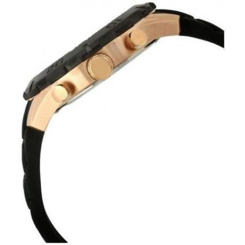 Модель имеет водонепроницаемость 100 м. Корпус выполнен из материала – сталь + PVD. Прочное минеральное стекло надежно защищает циферблат от ударов и других повреждений. Удобный каучук ремешок позволяет часам комфортно сидеть на запястье. Из дополнительных функций имеются: дополнительный показатель времени в 24-х часовом формате, секунды, хронограф.