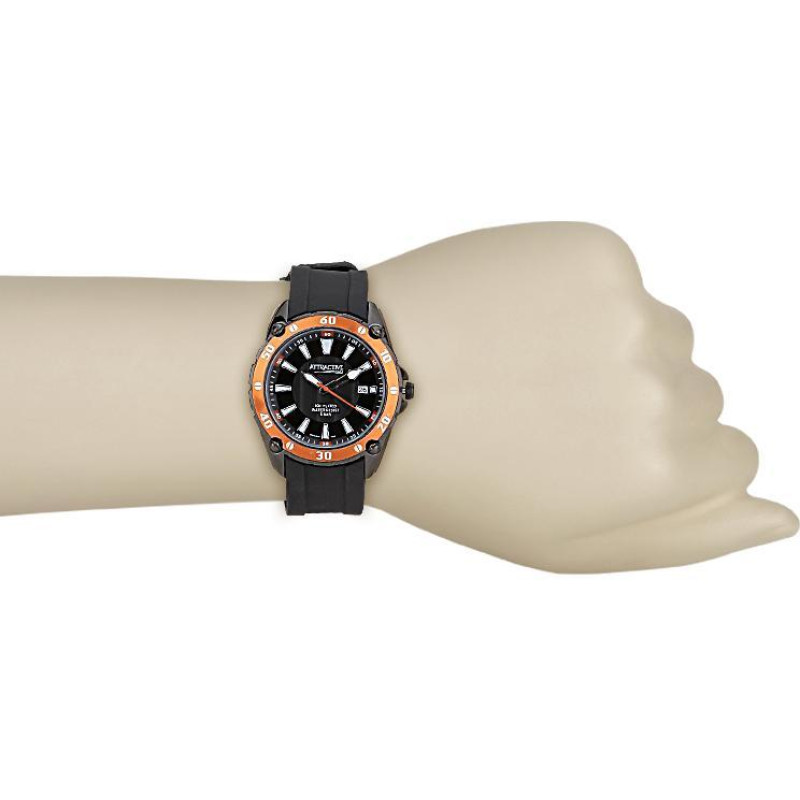 Люминесцентные стрелки и метки. Корпус частично покрыт чёрным PVD-покрытием. Безель покрыт оранжевым..