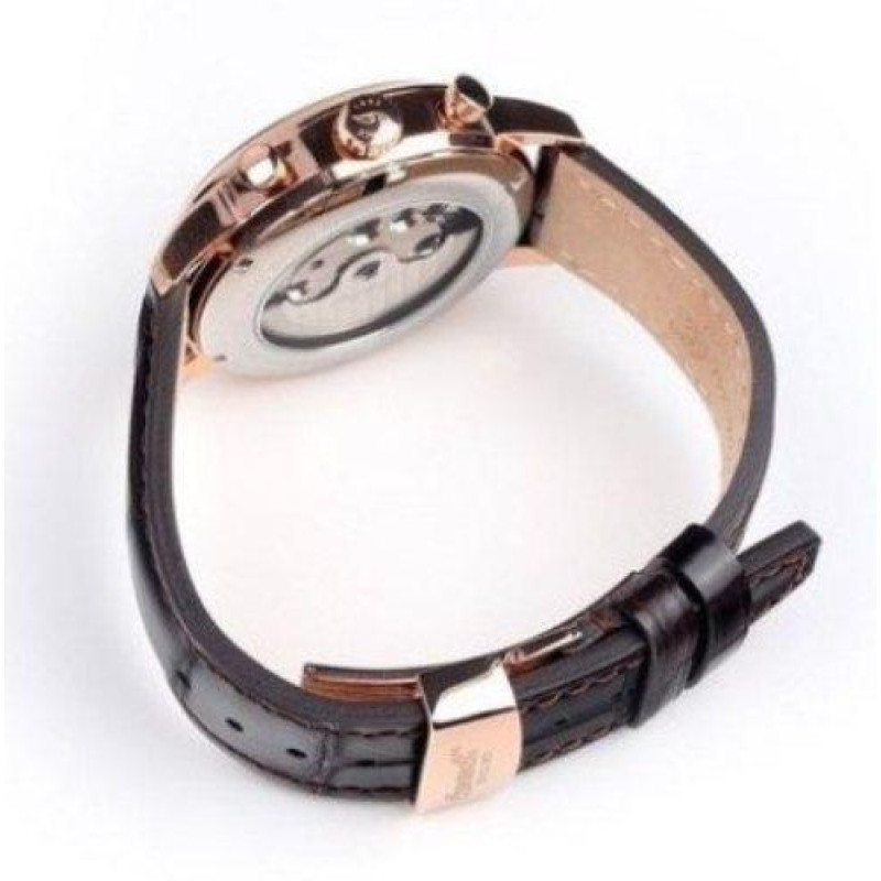 Модель имеет водонепроницаемость 50 м. Корпус выполнен из материала – сталь + PVD. Прочное минеральное стекло надежно защищает циферблат от ударов и других повреждений. Удобный кожаный ремешок позволяет часам комфортно сидеть на запястье. Из дополнительных функций имеются: дата, день недели, месяц, секунды.