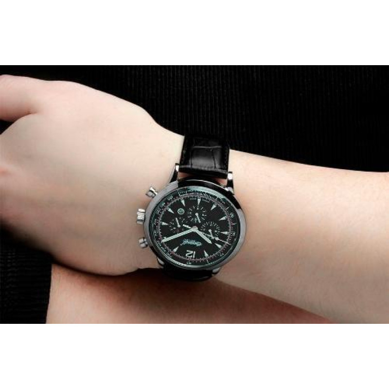 Модель имеет водонепроницаемость 30 м. Корпус выполнен из материала – сталь. Прочное минеральное стекло надежно защищает циферблат от ударов и других повреждений. Удобный кожаный ремешок позволяет часам комфортно сидеть на запястье. Из дополнительных функций имеются: дата, день недели, месяц, секунды, тахиметр.