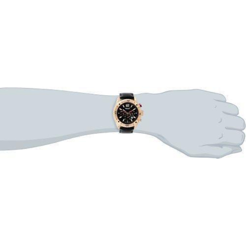 Модель имеет водонепроницаемость 50 м. Корпус выполнен из материала – сталь + PVD. Прочное минеральное стекло надежно защищает циферблат от ударов и других повреждений. Удобный кожаный ремешок позволяет часам комфортно сидеть на запястье. Из дополнительных функций имеются: дата, день недели, дополнительный показатель времени в 24-х часовом формате, месяц, секунды.