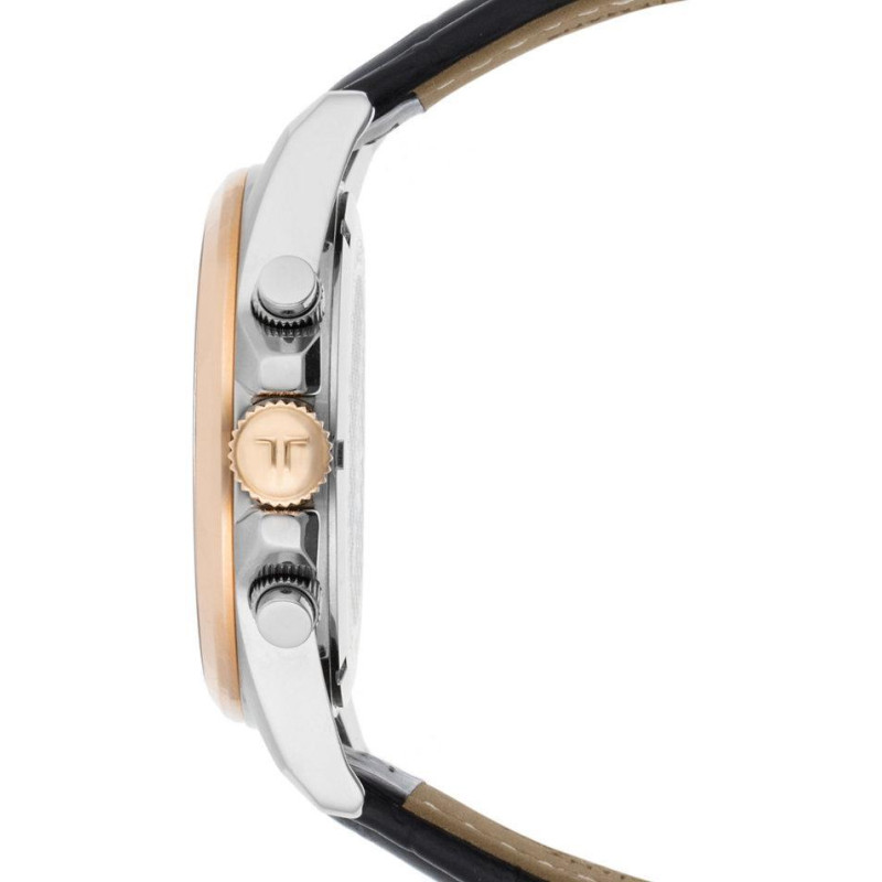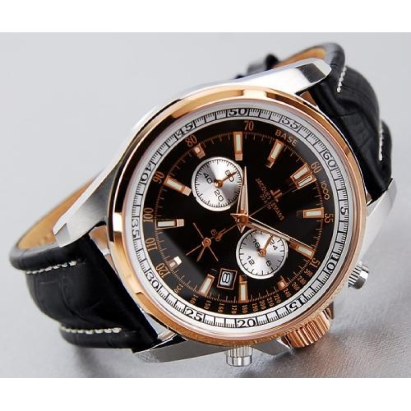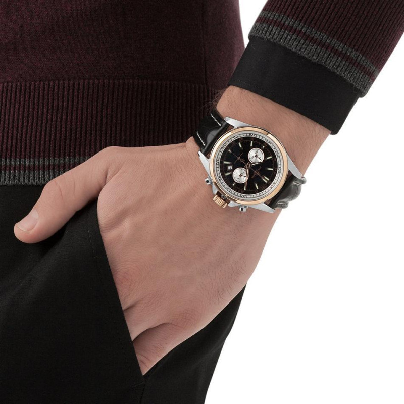Модель имеет водонепроницаемость 200 м. Корпус выполнен из материала – сталь + PVD. Прочное минеральное стекло надежно защищает циферблат от ударов и других повреждений. Удобный кожаный ремешок позволяет часам комфортно сидеть на запястье. Из дополнительных функций имеются: дата, хронограф.