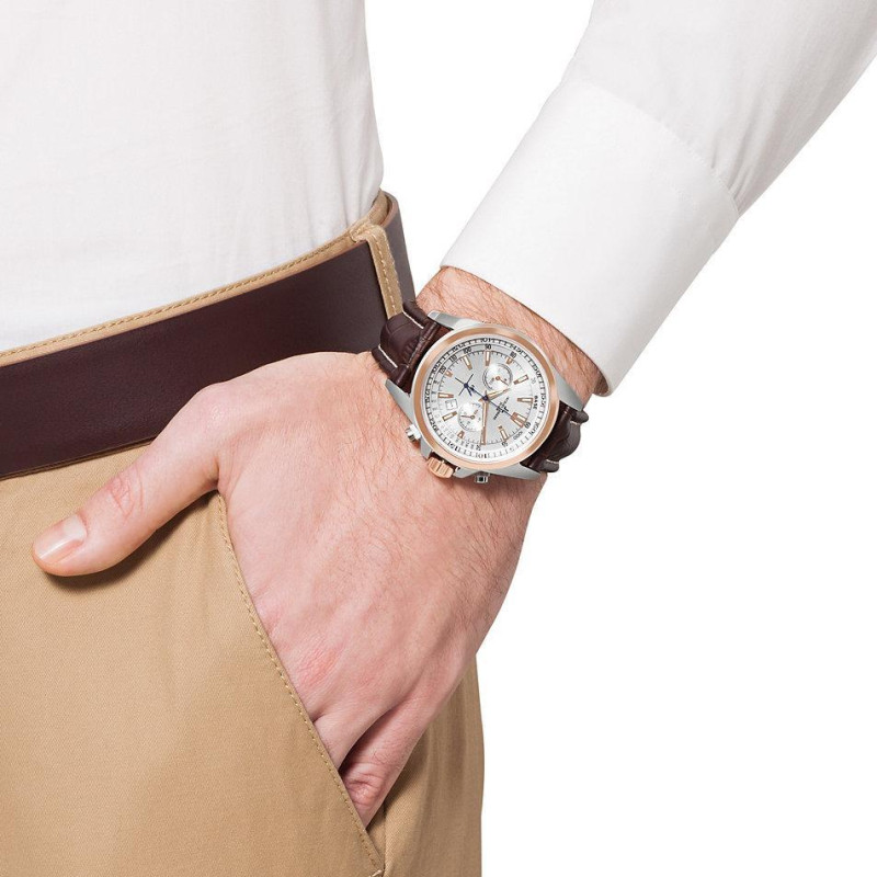 Модель имеет водонепроницаемость 200 м. Корпус выполнен из материала – сталь. Прочное минеральное стекло надежно защищает циферблат от ударов и других повреждений. Удобный кожаный ремешок позволяет часам комфортно сидеть на запястье. Из дополнительных функций имеются: дата, хронограф.
