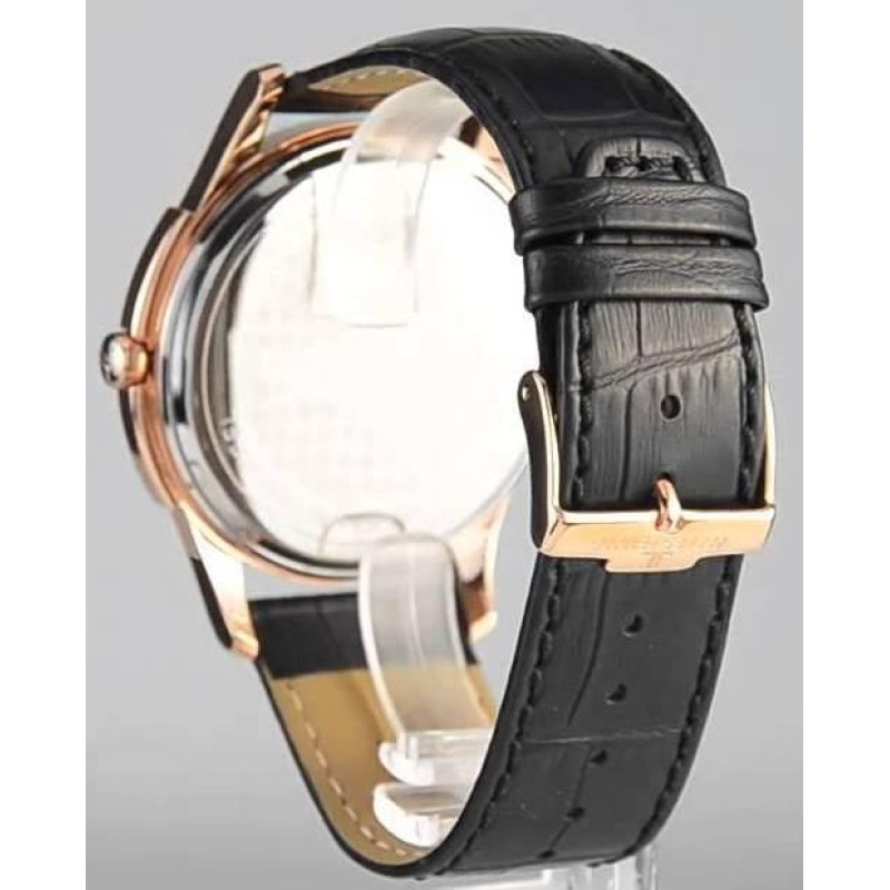 Модель имеет водонепроницаемость 50 м. Корпус выполнен из материала – сталь + PVD. Прочное минеральное стекло надежно защищает циферблат от ударов и других повреждений. Удобный кожаный ремешок позволяет часам комфортно сидеть на запястье. Из дополнительных функций имеются: GMT, год, дата, месяц.
