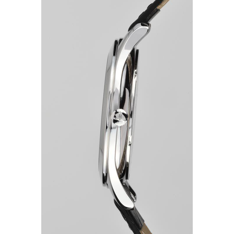 Модель имеет водонепроницаемость 100 м. Корпус выполнен из материала – сталь. Прочное минеральное стекло надежно защищает циферблат от ударов и других повреждений. Удобный кожаный ремешок позволяет часам комфортно сидеть на запястье. Из дополнительных функций имеются: секунды.