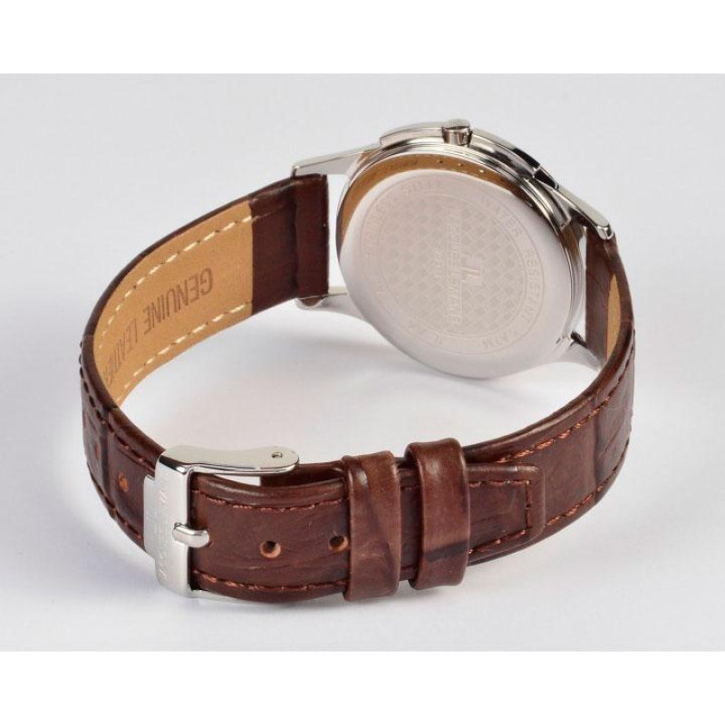 Модель имеет водонепроницаемость 50 м. Корпус выполнен из материала – сталь + PVD. Прочное минеральное стекло надежно защищает циферблат от ударов и других повреждений. Удобный кожаный ремешок позволяет часам комфортно сидеть на запястье.