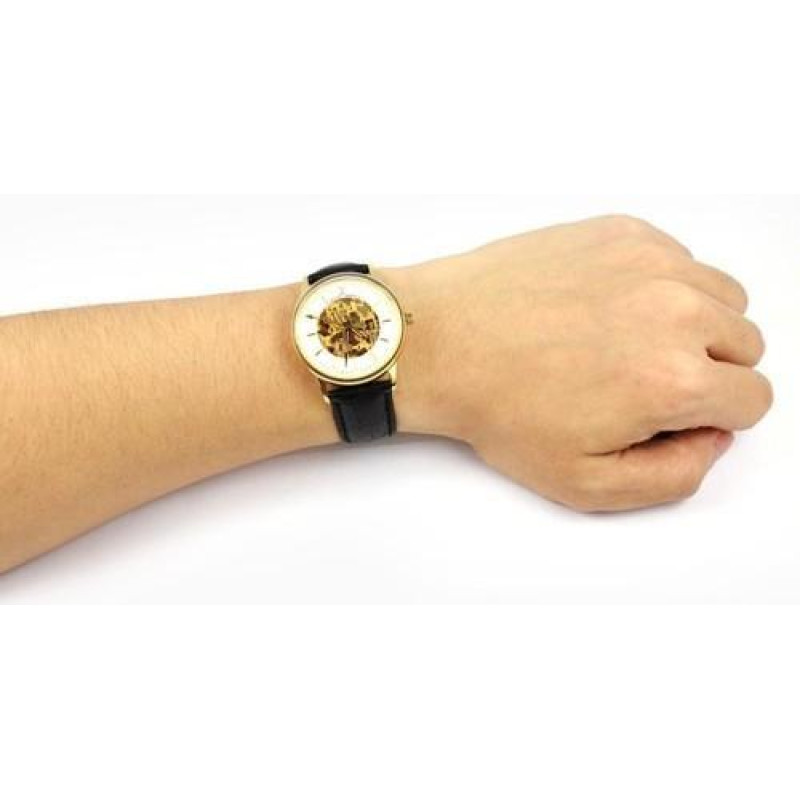 Корпус из нержавеющей стали и покрыт PVD — покрытием золотого цвета. Ремешок кожаный, чёрного цвета...