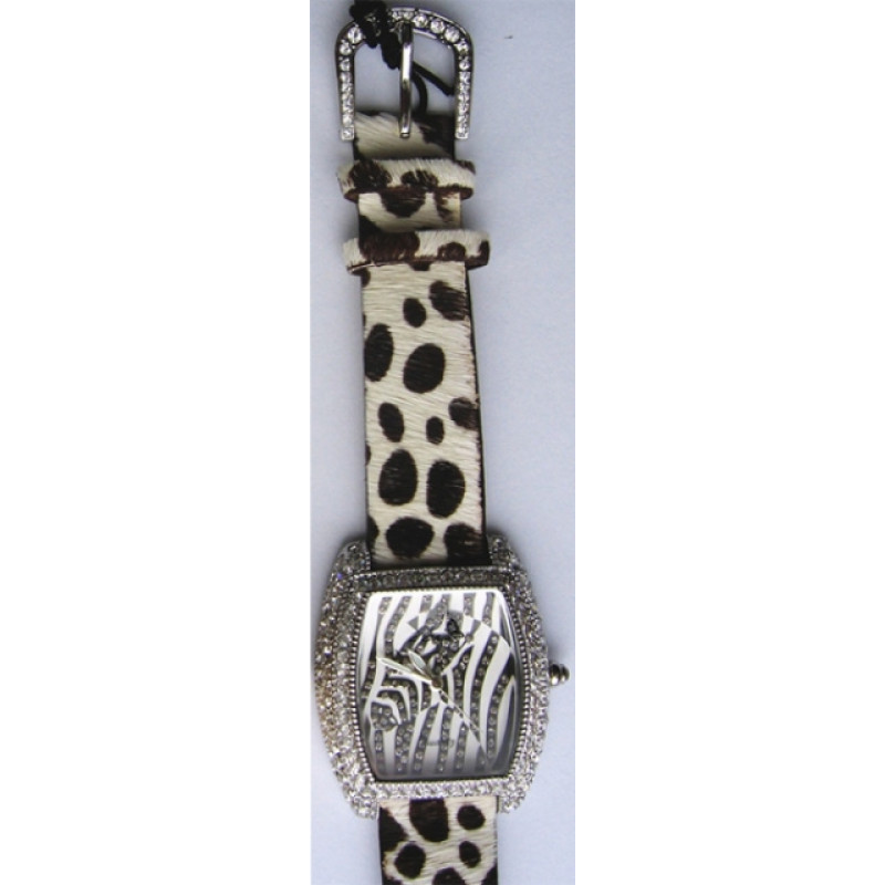 Циферблат декорирован эмалью и камнями Swarovski, Ремешок из кожи пони, механизм Miyota..