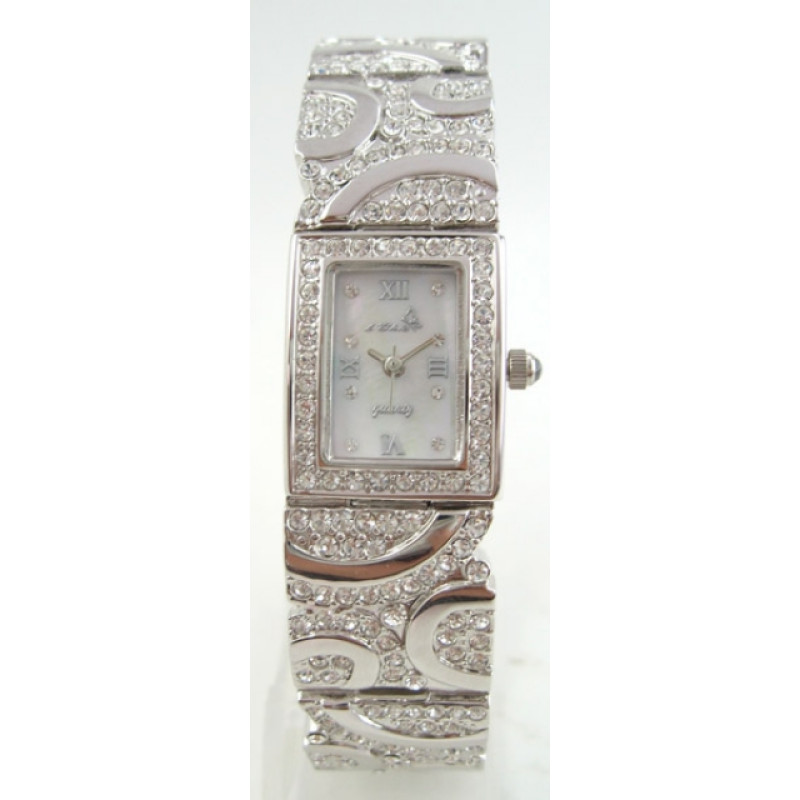 Перламутровый циферблат декорирован камнями Swarovski, браслет декорирован камнями Swarovski, механи..