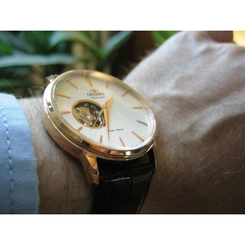 Модель Orient FDB08001W0 имеет частично открытый механизм, который видно через открытое окошко на циферблате. Данные часы отлично смотрятся под деловой костюм, поэтому их выбирают серьезные и стильные мужчины.