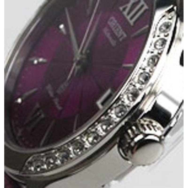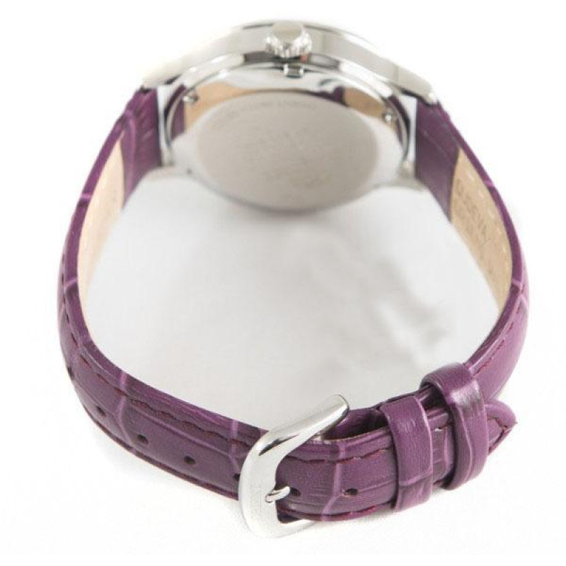 Фиолетовый кожаный ремешок. Корпус из нержавеющей стали и украшен цирконами. Цвет циферблата — фиоле..