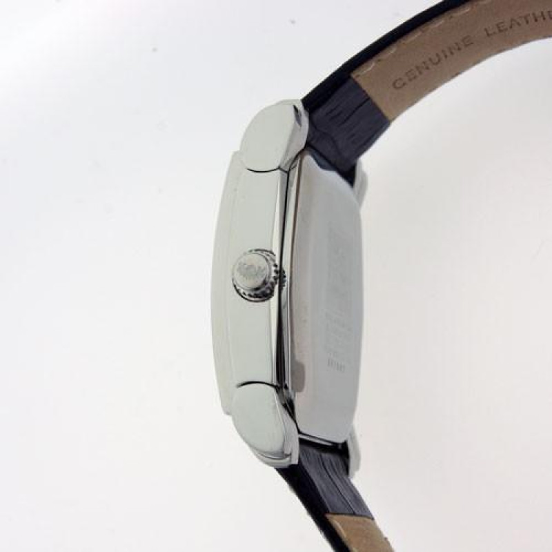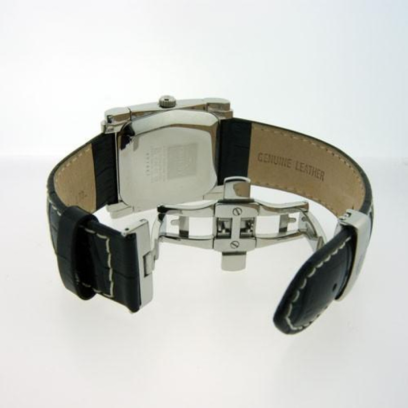 Корпус серебристого цвета. Кожаный ремешок черного цвета. Циферблат черного цвета. Стрелки с люминес..