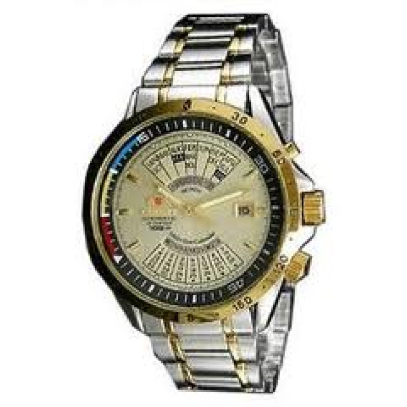 Модель имеет водонепроницаемость 100 м. Корпус выполнен из материала – сталь с позолотой. Прочное минеральное стекло надежно защищает циферблат от ударов и других повреждений. Удобный стальной с позолотой браслет позволяет часам комфортно сидеть на запястье. Из дополнительных функций имеются: год, дата, день недели, месяц.