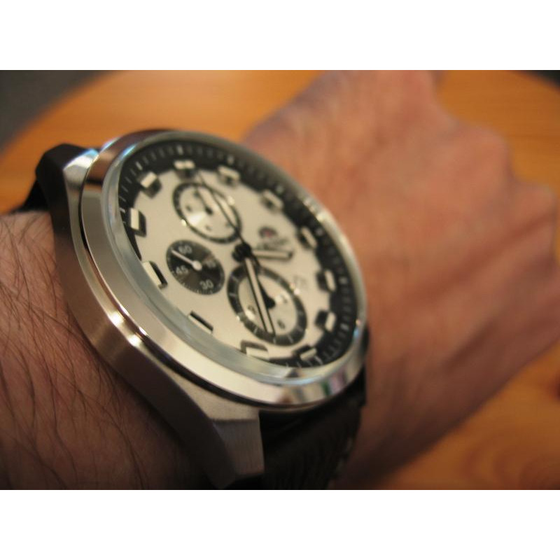 Модель имеет водонепроницаемость 100 м. Корпус выполнен из материала – сталь. Прочное минеральное стекло надежно защищает циферблат от ударов и других повреждений. Удобный кожаный ремешок позволяет часам комфортно сидеть на запястье. Из дополнительных функций имеются: дата, тахиметр, хронограф.