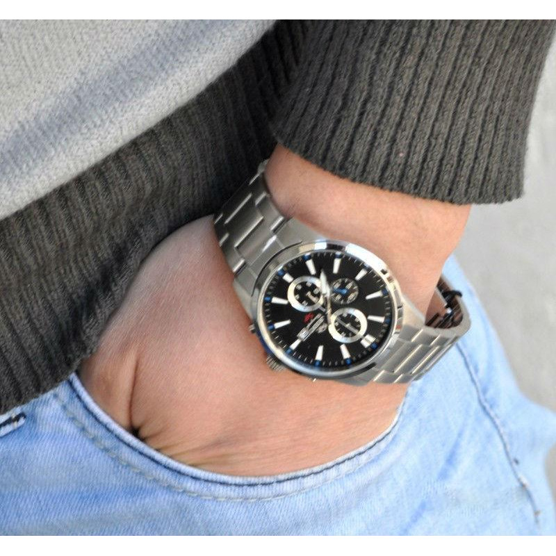 Модель имеет водонепроницаемость 30 м. Корпус выполнен из материала – сталь. Прочное минеральное стекло надежно защищает циферблат от ударов и других повреждений. Удобный стальной браслет позволяет часам комфортно сидеть на запястье. Из дополнительных функций имеются: дата, секунды, хронограф.