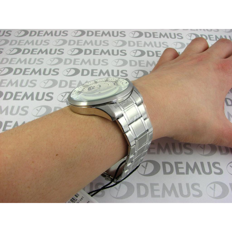 Модель имеет водонепроницаемость 50 м. Корпус выполнен из материала – сталь. Прочное минеральное стекло надежно защищает циферблат от ударов и других повреждений. Удобный стальной браслет позволяет часам комфортно сидеть на запястье. Из дополнительных функций имеются: дата, день недели, дополнительный показатель времени в 24-х часовом формате, минуты, секунды, часы.