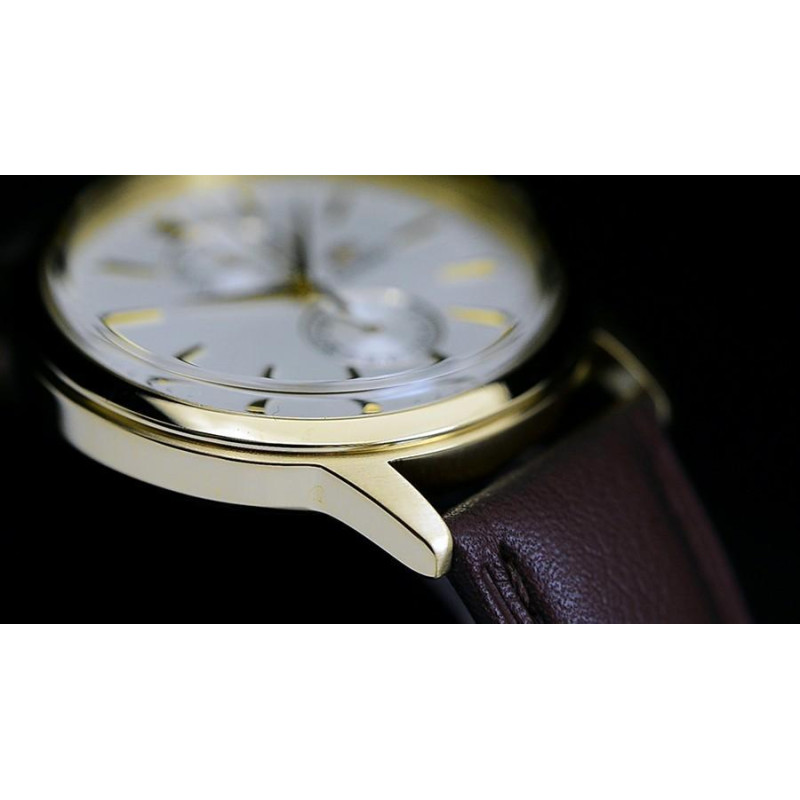 Корпус полностью покрыт золотым PVD-покрытием. Цвет циферблата - жёлтый. Цвет ремня - коричневый...