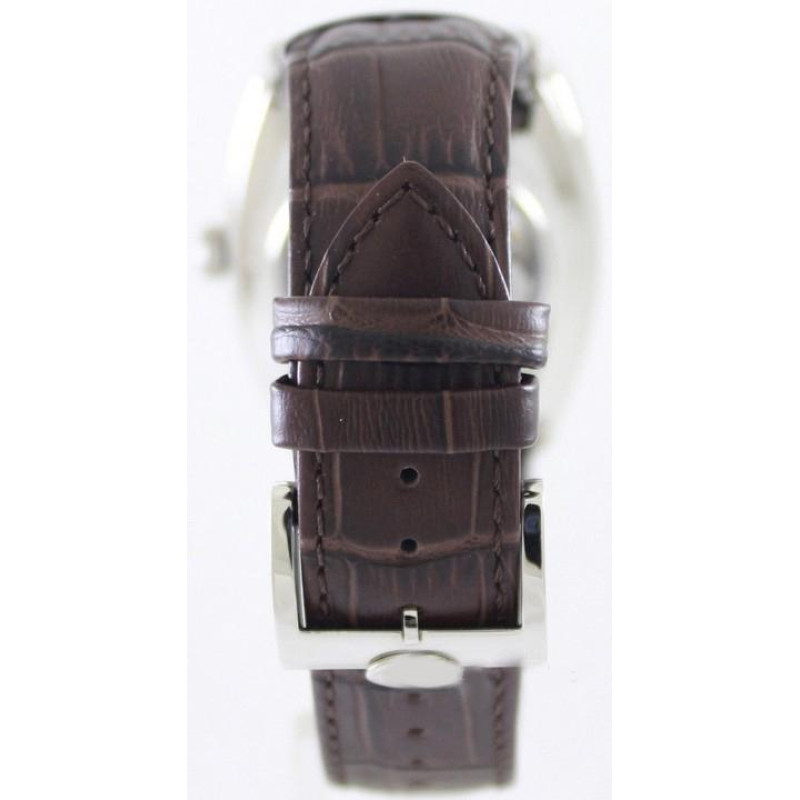 Модель имеет водонепроницаемость 50 м. Корпус выполнен из материала – сталь. Прочное сапфировое стекло надежно защищает циферблат от ударов и других повреждений. Удобный кожаный ремешок позволяет часам комфортно сидеть на запястье. Из дополнительных функций имеются: индикатор запаса хода, секунды.