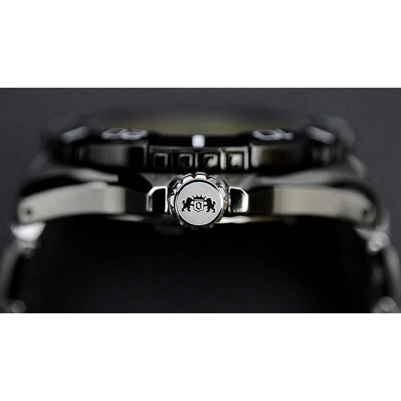Безель покрыт чёрным PVD-покрытием. Люминесцентные стрелки и метки. Завинчивающаяся заводная головка..