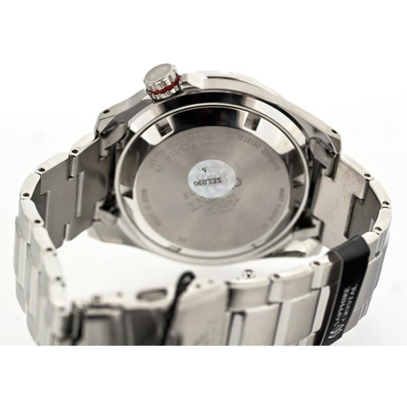 Модель имеет водонепроницаемость 200 м. Корпус выполнен из материала – сталь + PVD. Прочное сапфировое стекло надежно защищает циферблат от ударов и других повреждений. Удобный стальной браслет позволяет часам комфортно сидеть на запястье. Из дополнительных функций имеются: вращающийся безель, дата, индикатор запаса хода, минуты, секунды, часы.