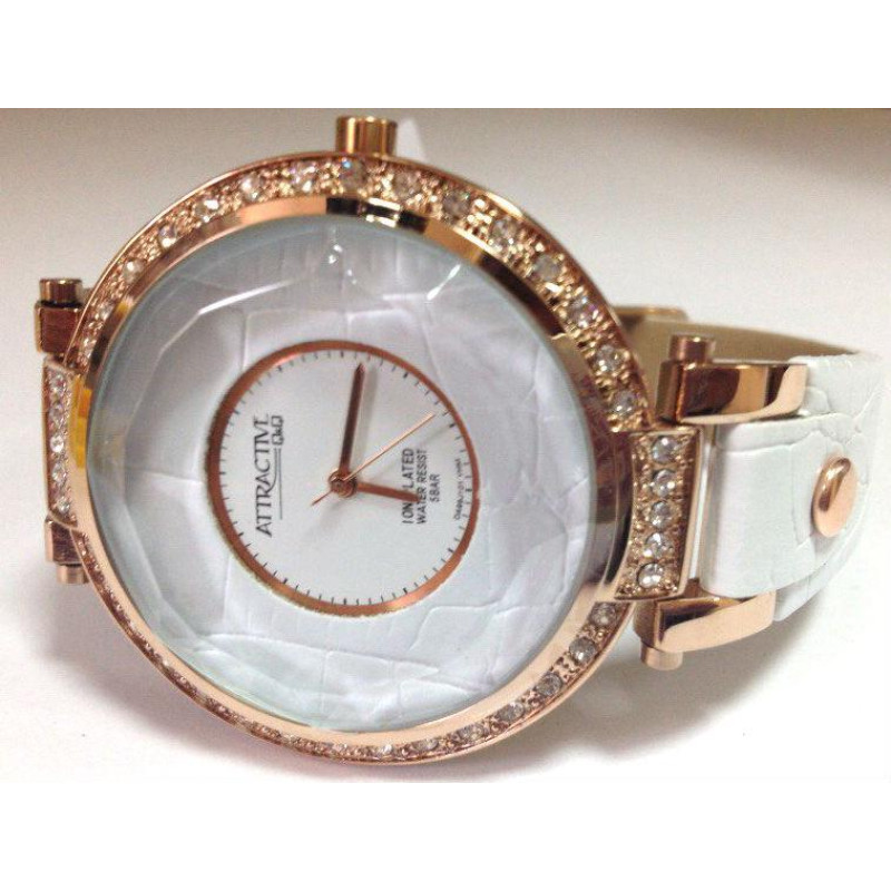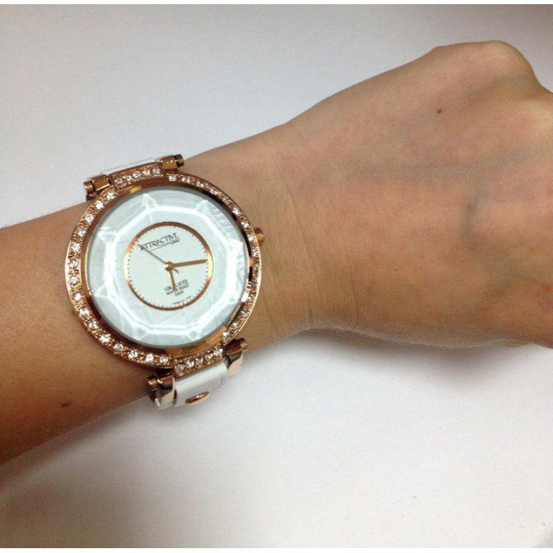 Белый кожаный ремешок. Корпус с PVD-покрытием цвета розового золота и украшен камушками фианита. Мин..
