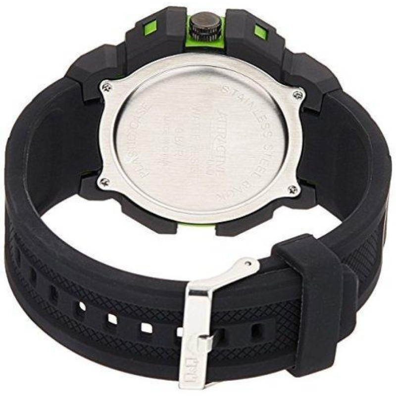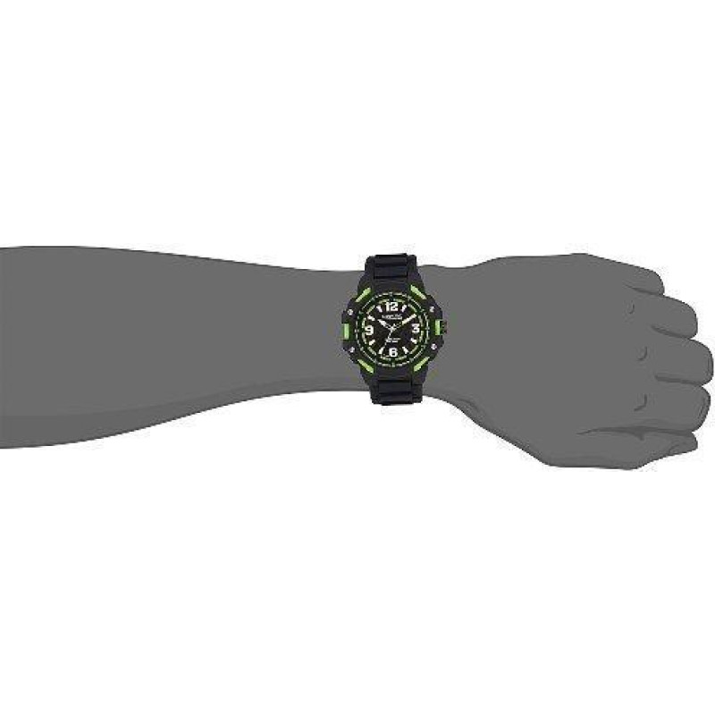 Часы оснащены японским механизмом Miyota. Корпус изготовлен из пластика. На чёрно-зелёном циферблате..