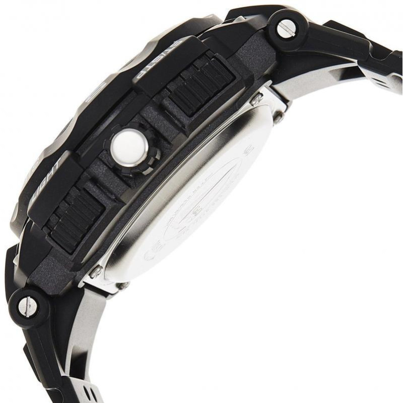 Модель имеет водонепроницаемость 100 м. Корпус выполнен из материала – комбинированный (сталь/пластик). Прочное пластиковое стекло надежно защищает циферблат от ударов и других повреждений. Удобный полимер ремешок позволяет часам комфортно сидеть на запястье. Из дополнительных функций имеются: будильник, дата, день недели, секундомер, секунды, таймер, электролюминесцентная подсветка.