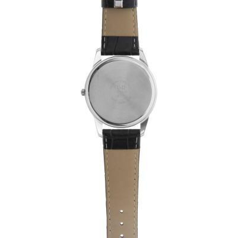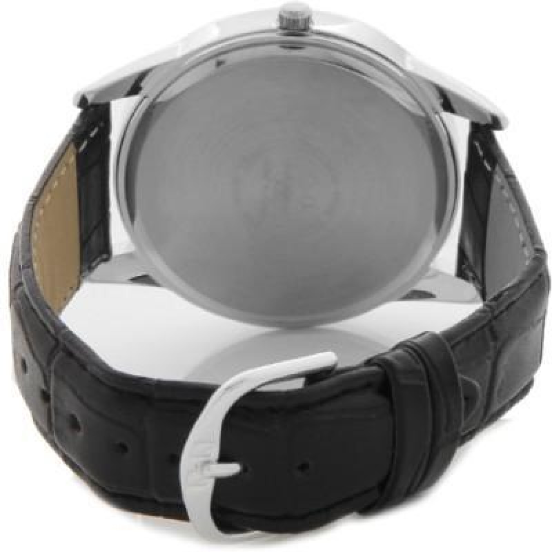 Чёрный кожаный ремешок. Корпус серебристого цвета, глянцевый. Цвет циферблата — белый. Вид циферблат..