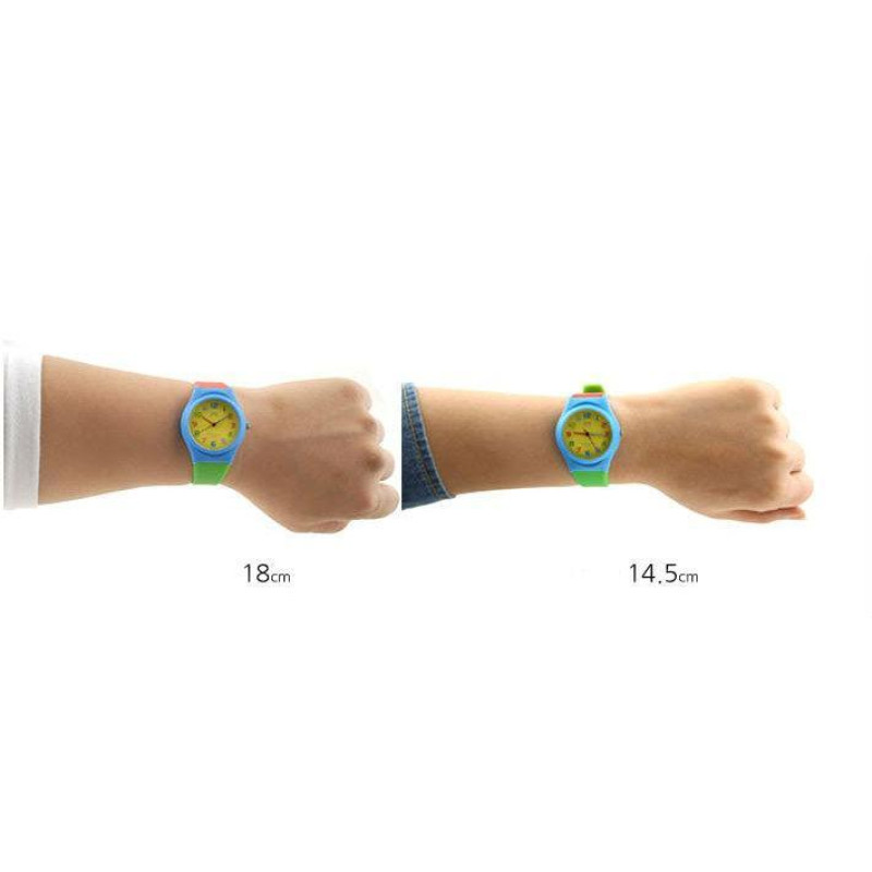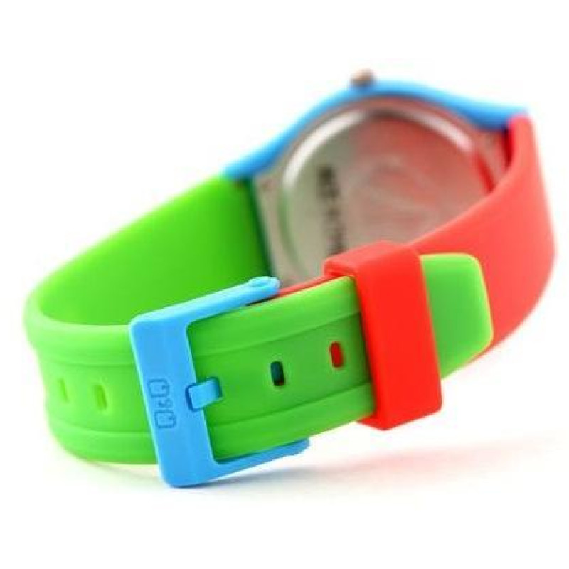 Корпус и застёжка голубого цвета. Ремешок двухцветный - красный и зелёный. Цвет циферблата — жёлтый...