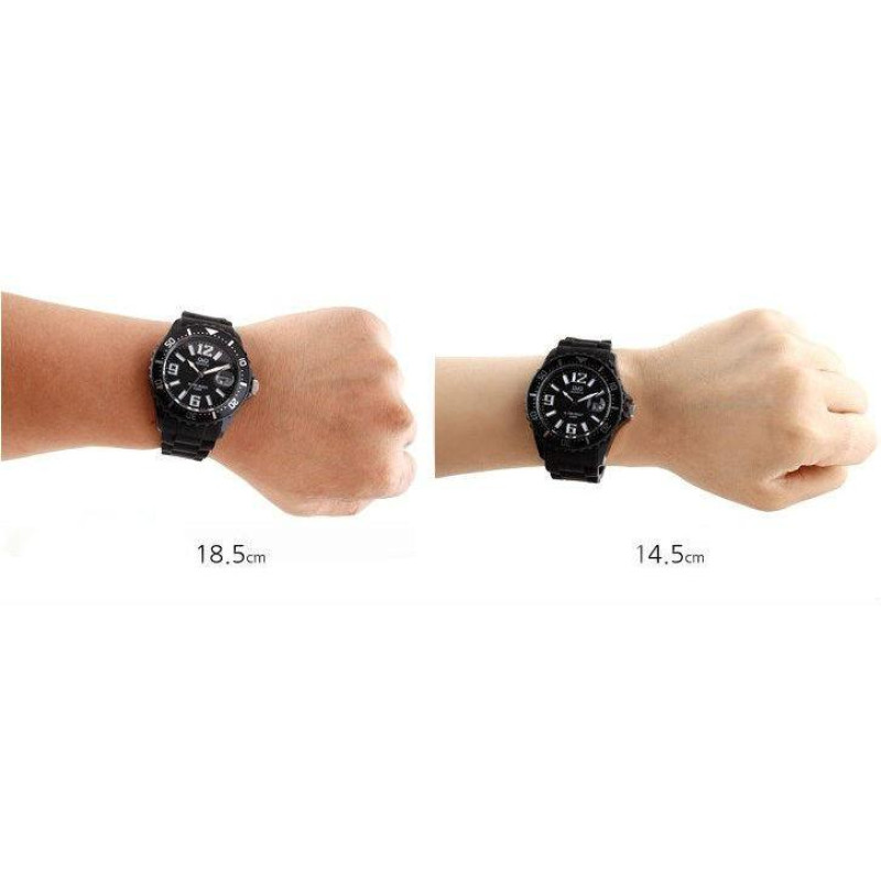 Модель имеет водонепроницаемость 50 м. Корпус выполнен из материала – пластик. Прочное пластиковое стекло надежно защищает циферблат от ударов и других повреждений. Удобный силиконовый ремешок позволяет часам комфортно сидеть на запястье. Из дополнительных функций имеются: дата, секунды.