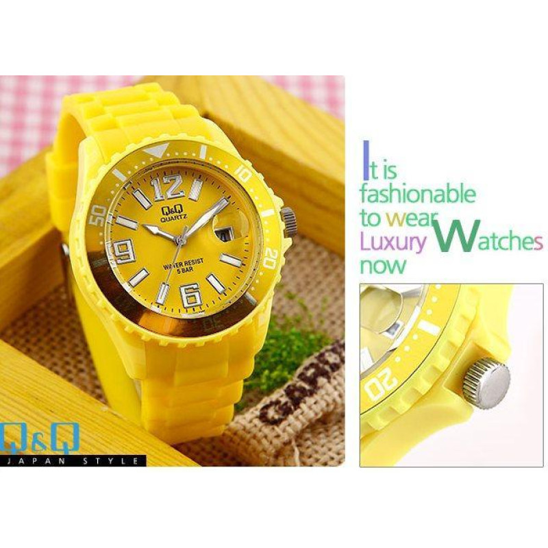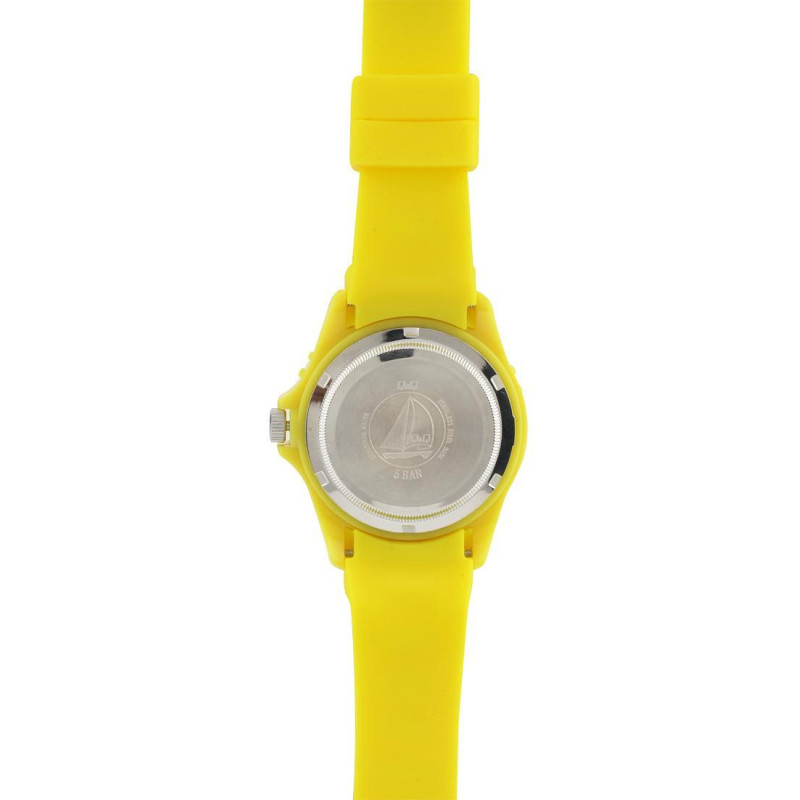Жёлтый силиконовый ремешок. Корпус жёлтого цвета. Цвет циферблата — жёлтый. Вид циферблата — арабски..
