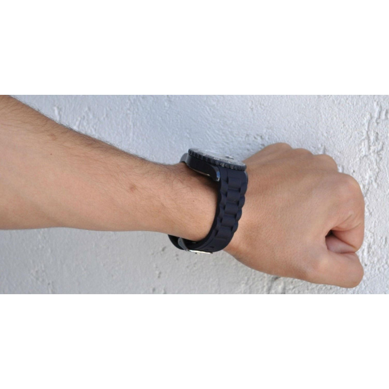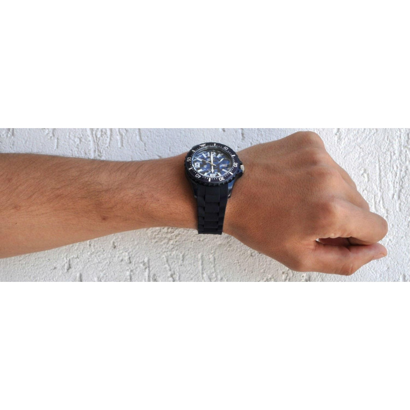 Модель имеет водонепроницаемость 50 м. Корпус выполнен из материала – латунь + пластик. Прочное минеральное стекло надежно защищает циферблат от ударов и других повреждений. Удобный силиконовый ремешок позволяет часам комфортно сидеть на запястье. Из дополнительных функций имеются: дата, секунды.