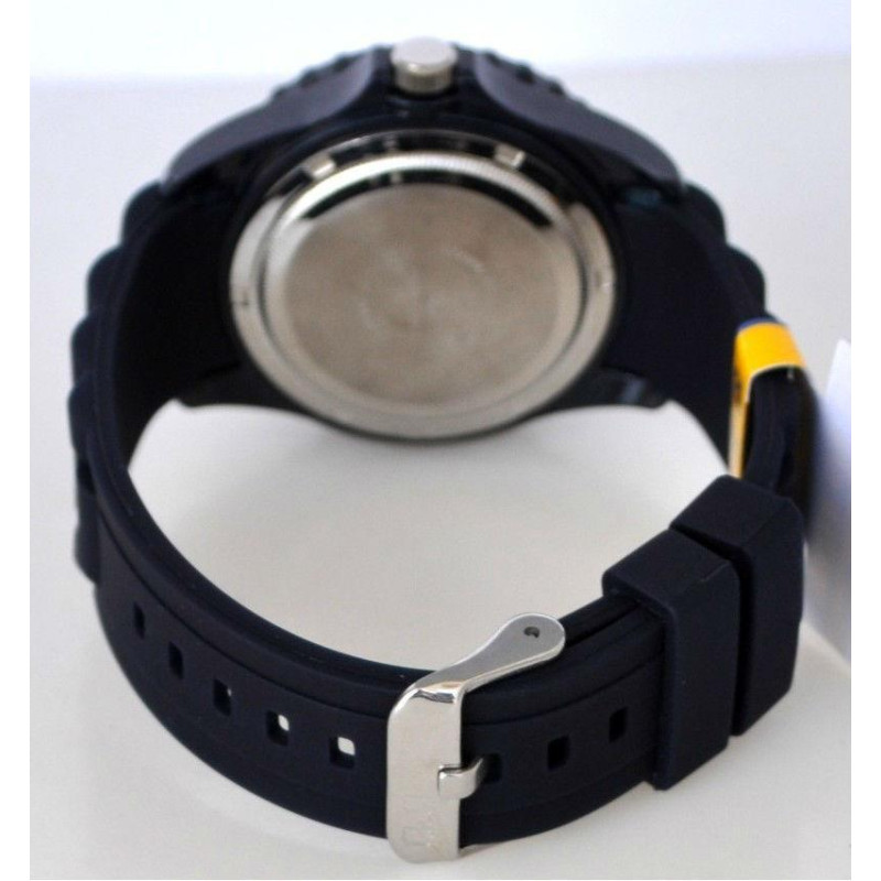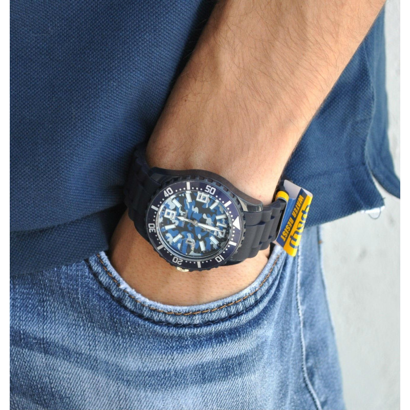 Корпус из латуни и пластика, синего цвета. Ремешок силиконовый, синего цвета. Цвет циферблата — сине..