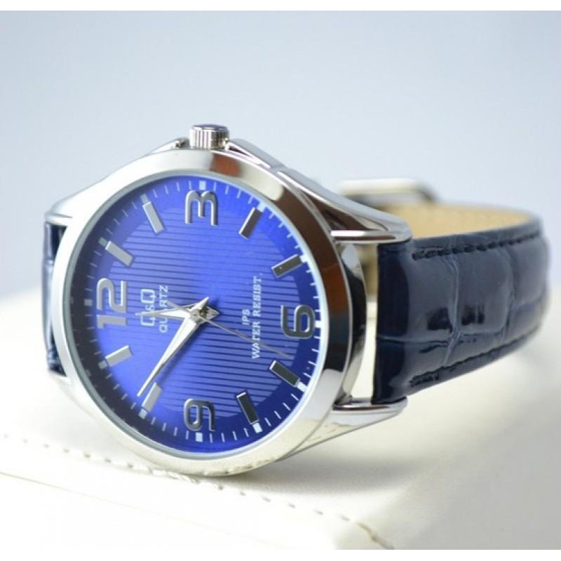 Люминесцентные стрелки. Тёмно-синий кожаный ремешок. Ширина ремешка — 17 мм. Цвет циферблата — синий..