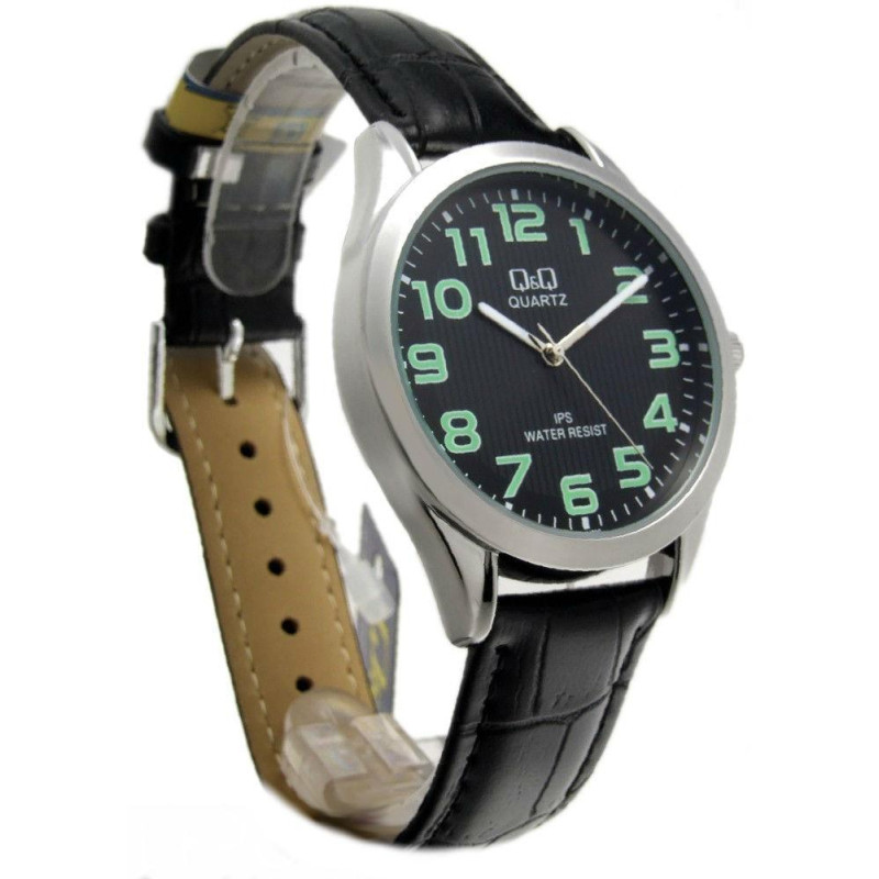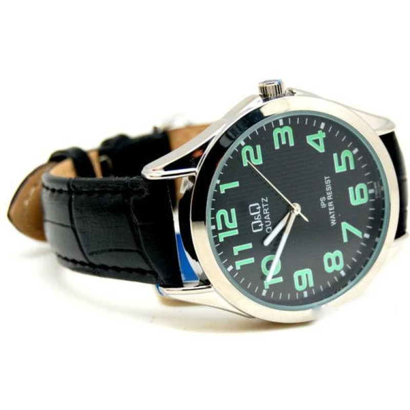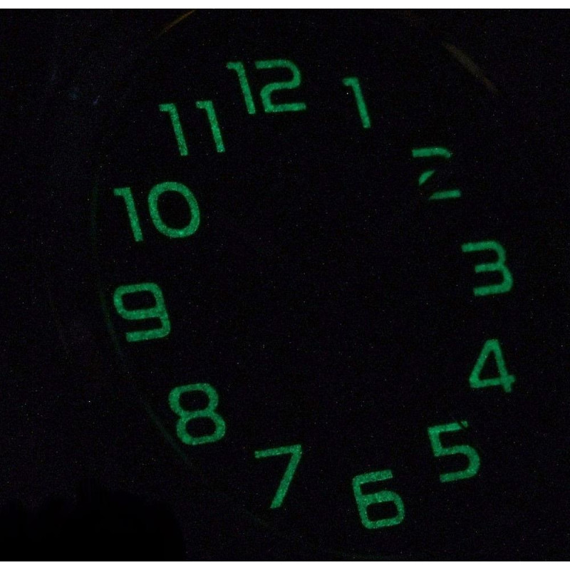 Цифры и стрелки с люминесцентным покрытием, которое обеспечивает свечение в темноте. Чёрный кожаный ..