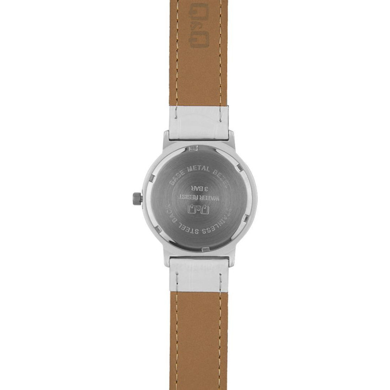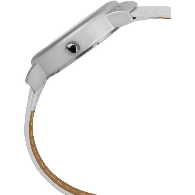 Белый кожаный ремешок. Корпус серебристого цвета. Цвет циферблата — серебристый. Вид циферблата — ар..