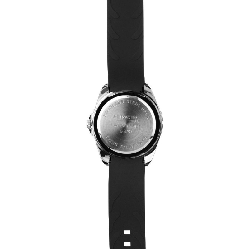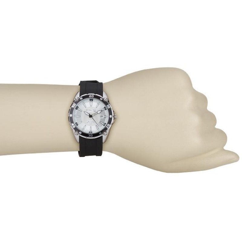Люминесцентные стрелки. Безель покрыт чёрным PVD-покрытием. Цвет циферблата — серебристый. Вид цифер..