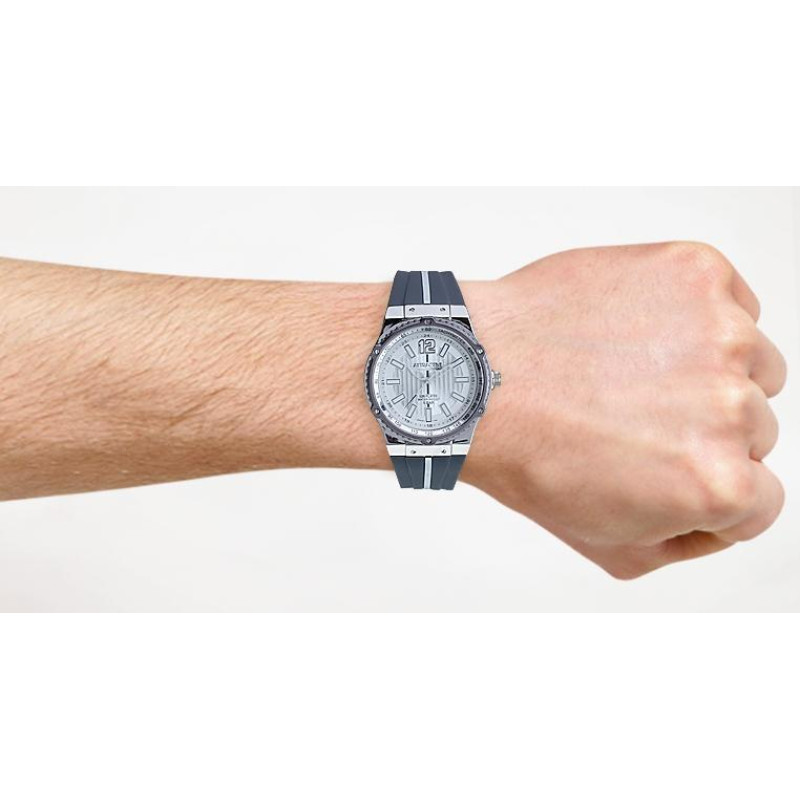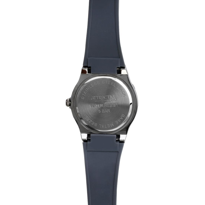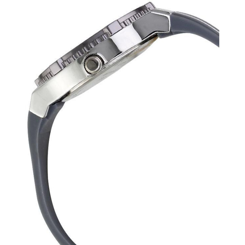 Серый полимерный ремешок. Безель покрыт серым PVD-покрытием. Циферблат — серебристого цвета. Вид циф..